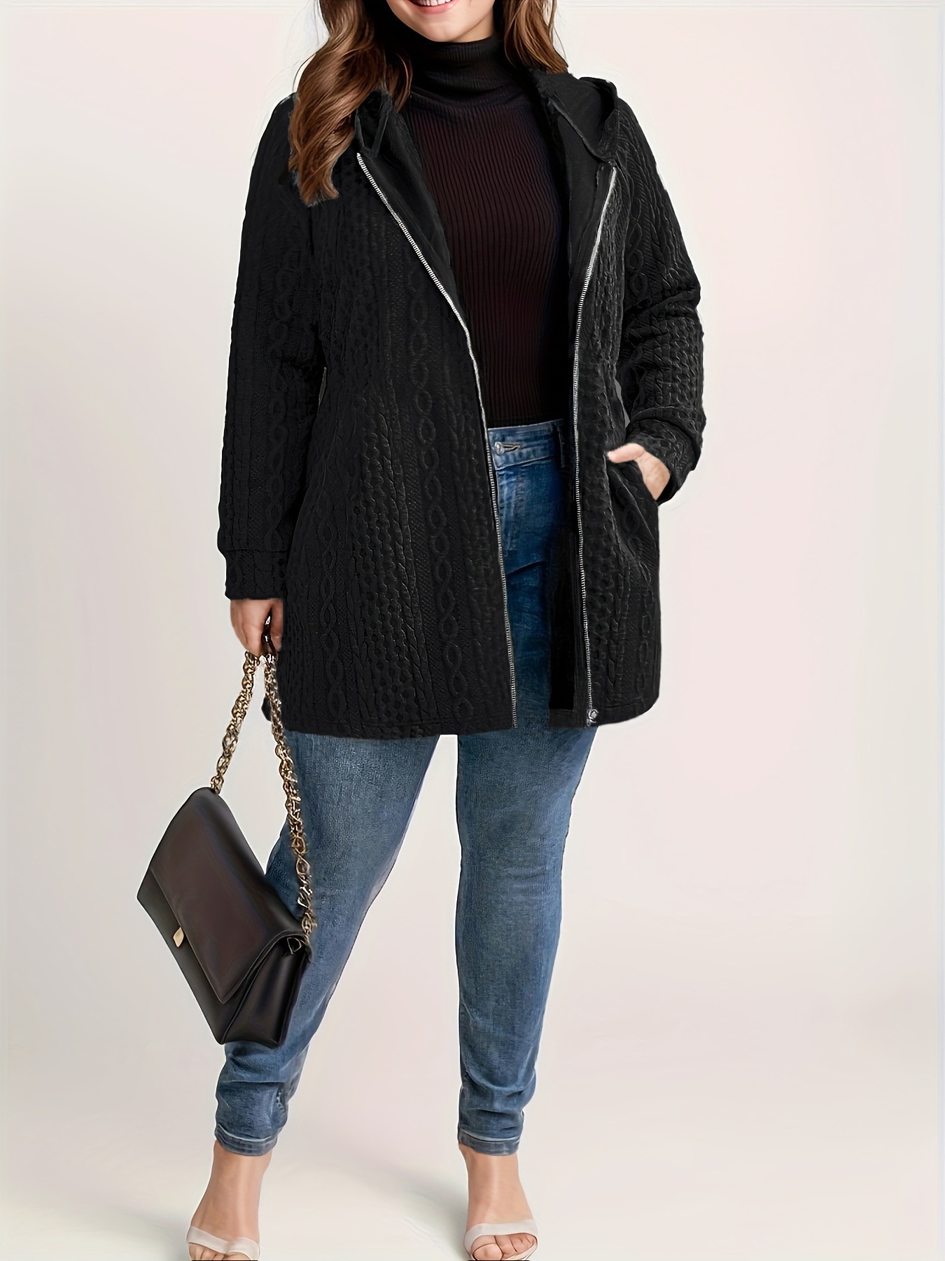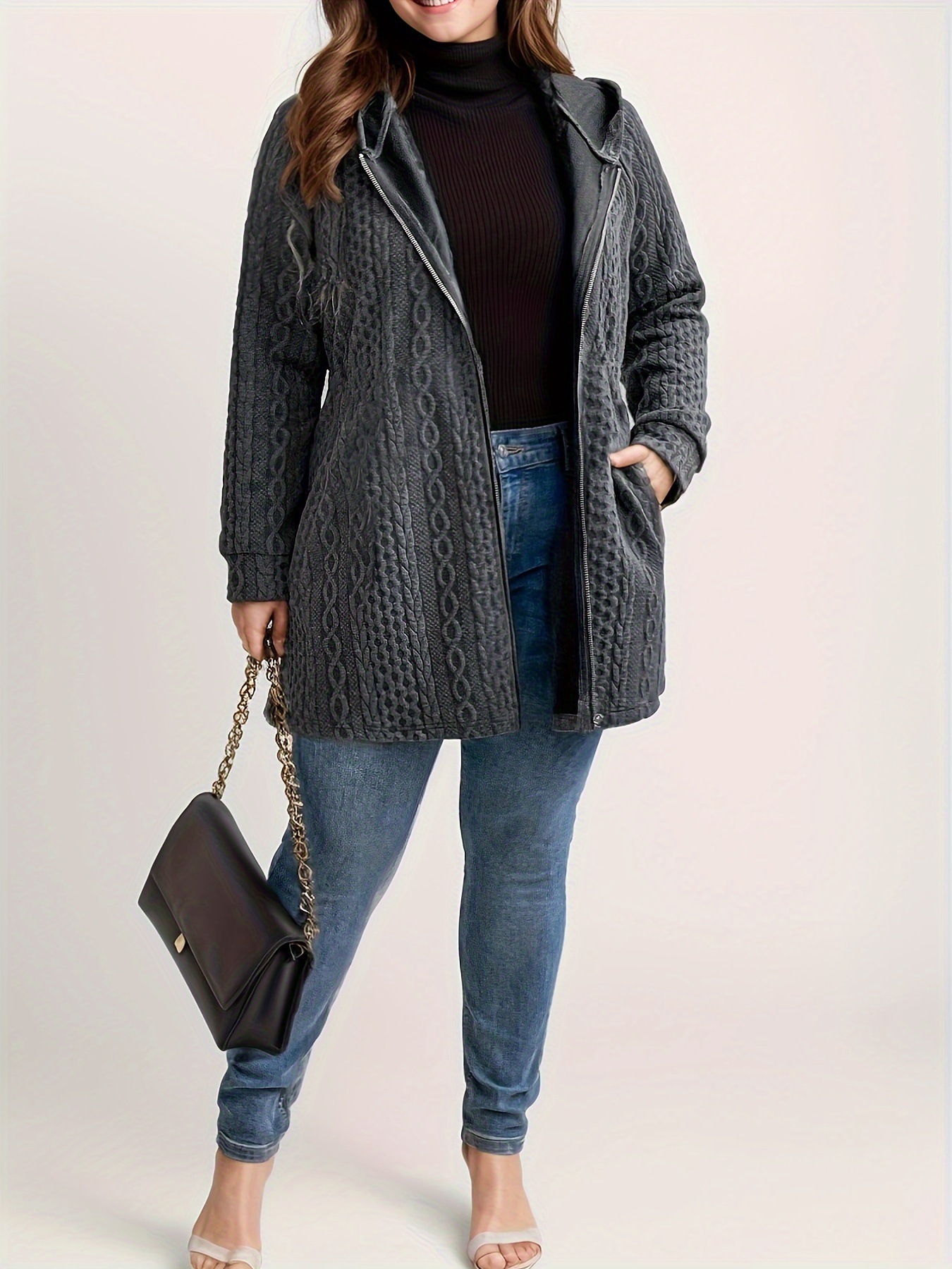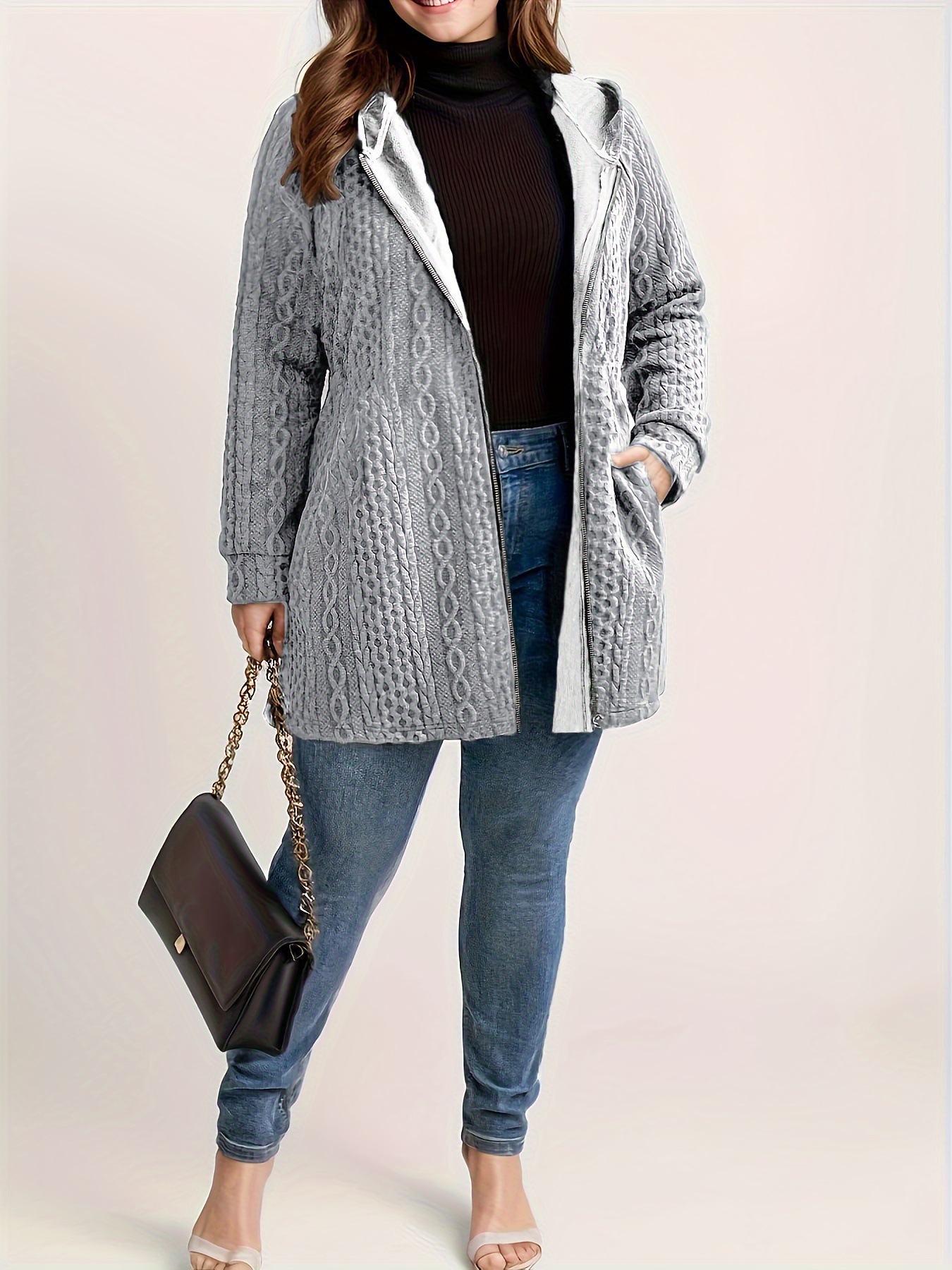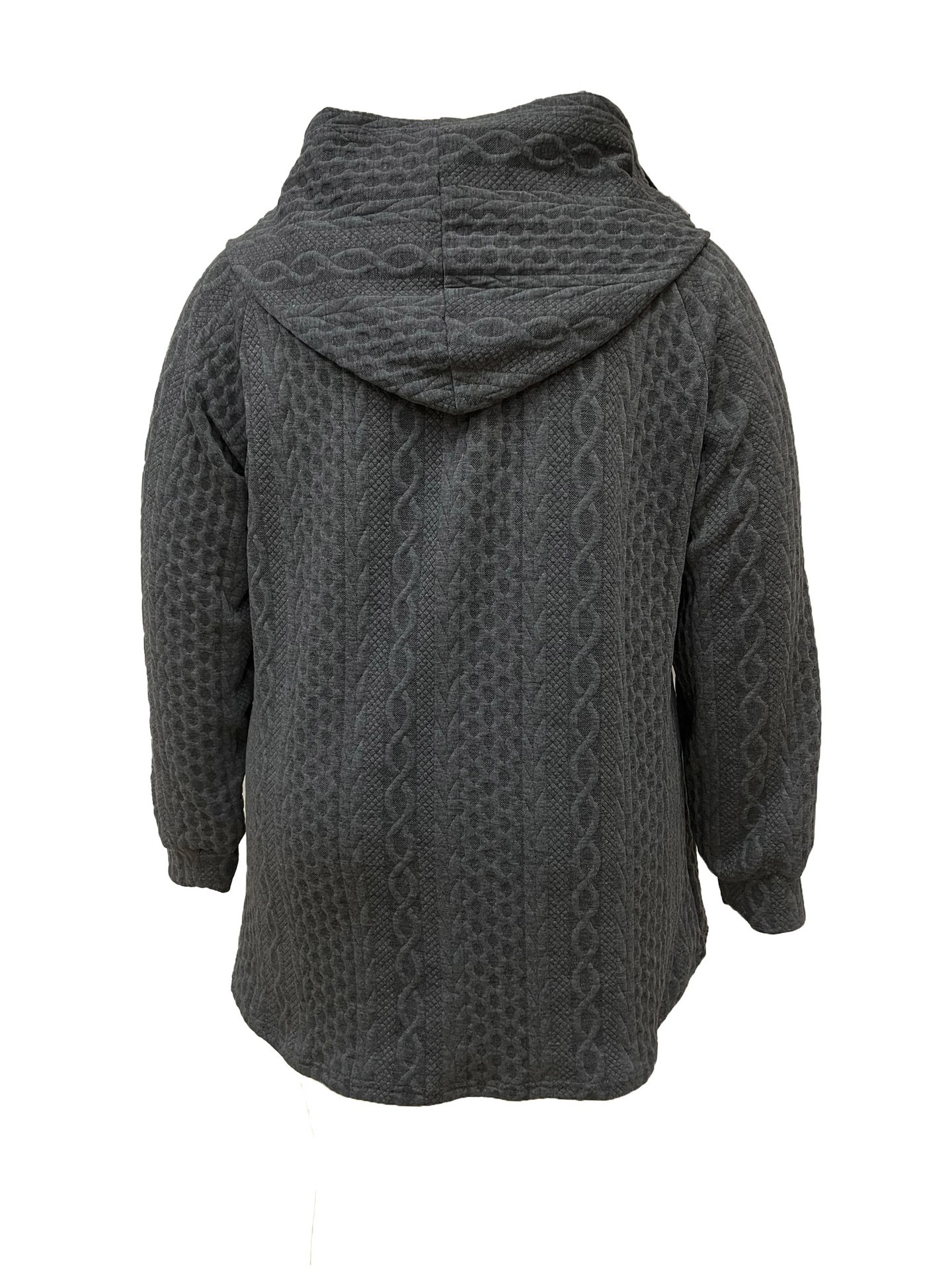 Women's Solid-Color Wavy-Pattern Patchwork Hooded Coat With Pockets